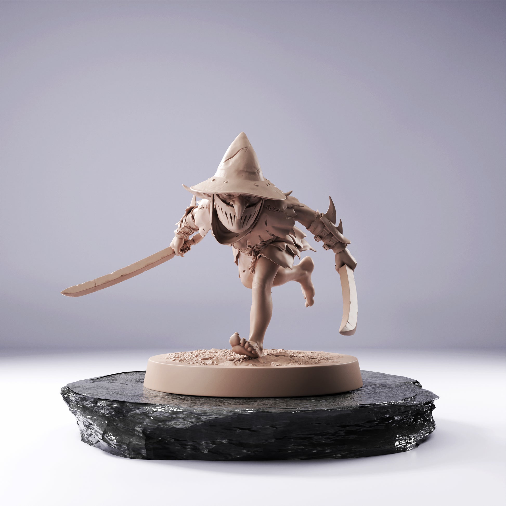 To niezwykle dynamiczna miniatura Goblina z dwoma mieczmi , stworzona z myślą o sesjach popularnych gier RPG, Dungeons & Dragons 5e, Pathfinder, Tainted Grail i innych. Figurka dobrze sprawdzi się jako efektowny model kolekcjonerski, ekspresyjna poza i bardzo wysoki poziom detali sprawiają, że figurka natychmiast przyciąga wzrok i wyraźnie wyróżnia się podczas rozgrywki na żywo.